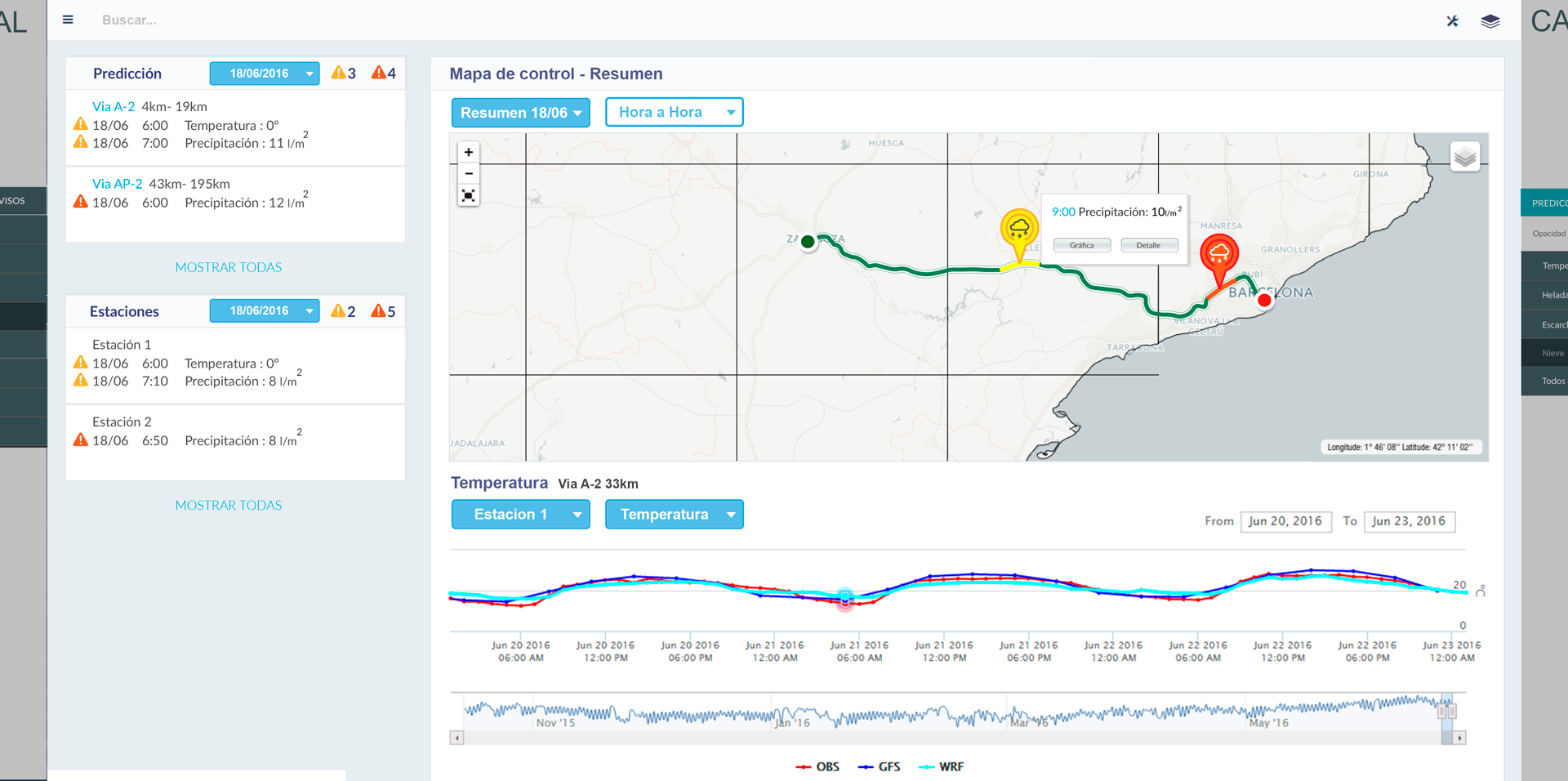 Programación de cualquier ruta al instante con información detallada sobre las condiciones durante el trayecto. Gracias al configurador de avisos se pueden generar alertas cuando en esa ruta no se den las condiciones adecuadas.
